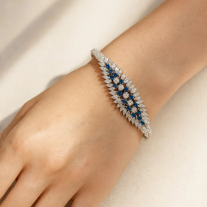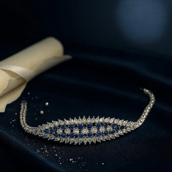 Lunáris is the embodiment of regal mystery — a cascade of brilliant diamonds and royal blue stones, set like a crown of stars. Crafted to command attention, worn to leave a legacy.