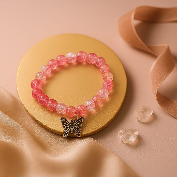Séraphine is where innocence meets inner fire — a bracelet of shimmering rose quartz tones, kissed with a golden butterfly charm. Soft, feminine, and quietly powerful.